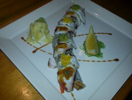 Not yet on the menu, this delicious roll brings together spicy tuna, eel, and a yama gobo roll. The awesome factor then continues by topping the rolls with tako (octupus), wasabi, and yuzu tobiko.