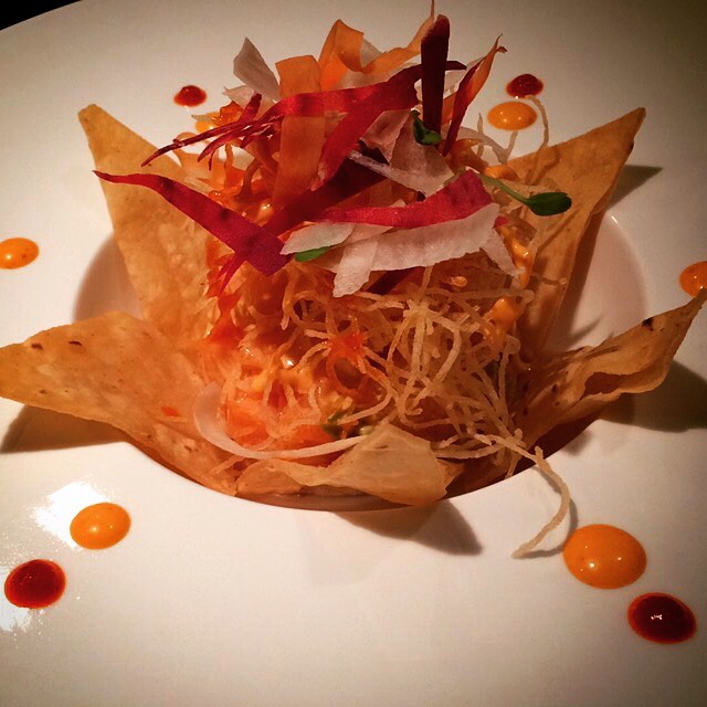 Spicy salmon tartare appetizer February 18, 2015 Spicy salmon tartare, pronounced “tah tah” (jk). Mix of spicy salmon and avocado, in a tortilla chip flower. Topped with potato crisps and thin radish. #avocado #bluefin2 #radish #salmon #tortilla #appetizer #byob #sushi #tartare Share this: Click to share on X (Opens in new window) X Click to share on Facebook (Opens in new window) Facebook Like Loading... Related