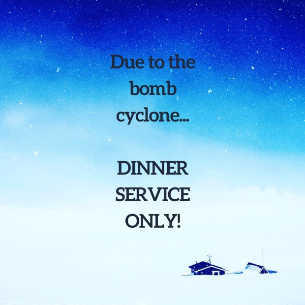 Attention! It’s cold. And there is a “bomb cyclone.” So we will be open only for dinner service today. Please check out Facebook/insta/our website for the 411, always!