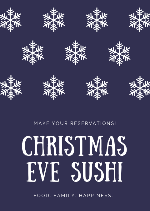 Booking up for Christmas Eve Plans! December 11, 2018 Have you made your Christmas Eve plans yet? We are already booking up! Call/reserve online today for 🍣 (best idea ever). Share this: Click to share on X (Opens in new window) X Click to share on Facebook (Opens in new window) Facebook Like Loading... Related