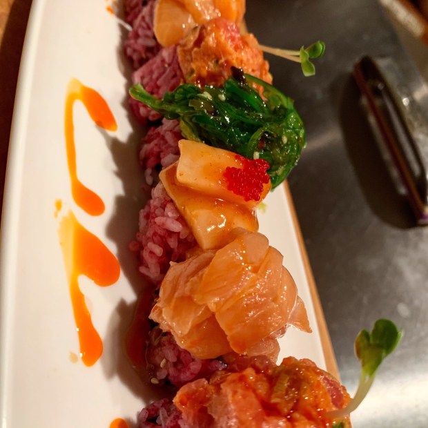 Top: 2 bites spicy tuna, 2 bites white tiger, 2 bites salmon avocado with truffle oil, 1 bite seaweed salad, 1 bite marinated Korean beets.