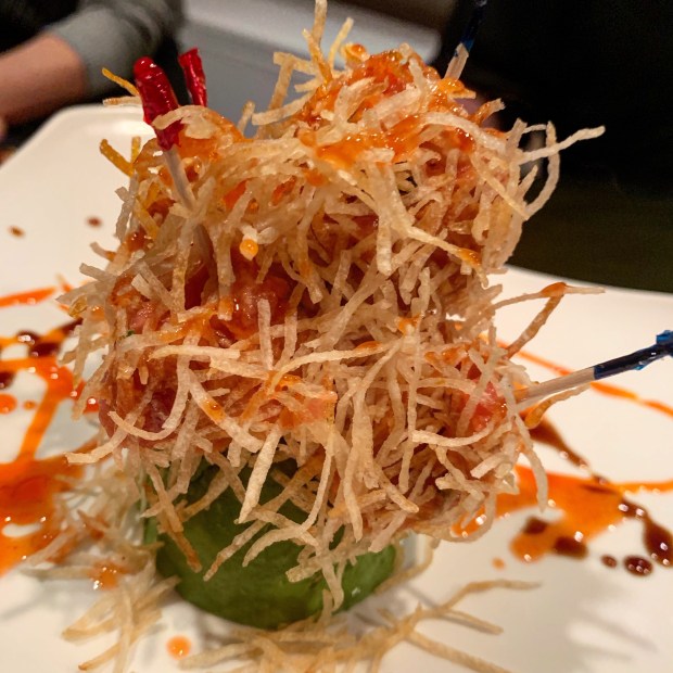 Good items involved: spicy tuna, tiny French fries, sauces, and avocado